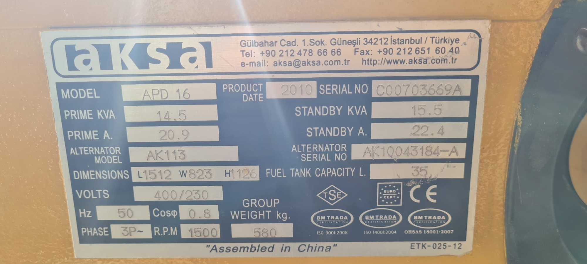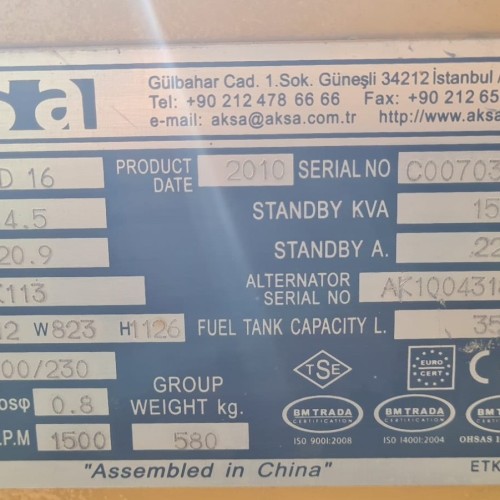 2. El 15 kVA DİZEL OTOMATİK KABİNLİ AKSA JENERATÖR