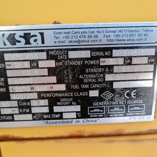 40 KVA DİZEL OTOMATİK KABİNLİ AKSA JENERATÖR